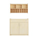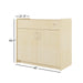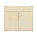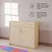Natural finish, professional‑grade changing table with double‑door storage cabinet and safety strap. |