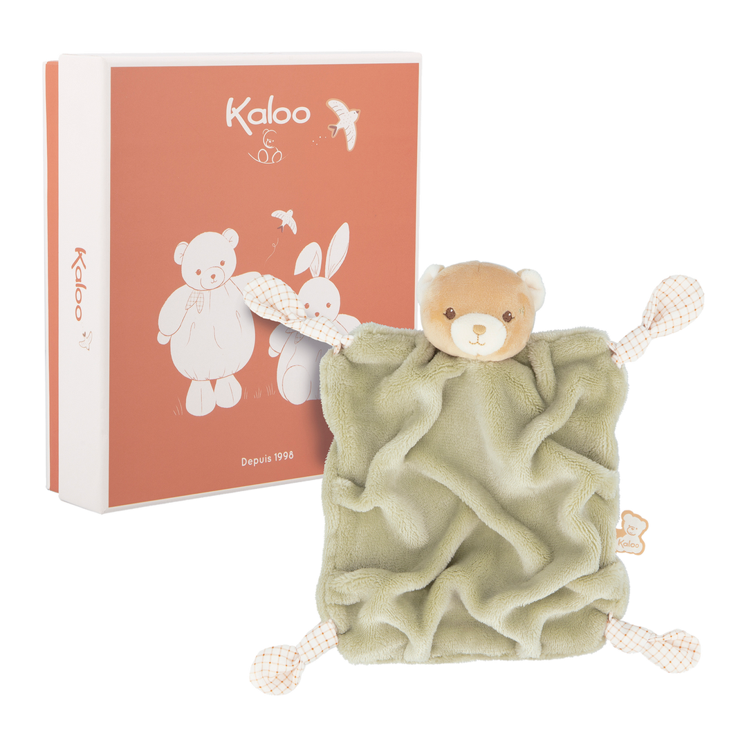 View full detailsThe Kaloo Green Teddy Bear Comforter (24 cm) blends softness, practicality, and elegance. Made from 86 % recycled materials (flannel fur, micro‑vel...