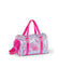 Blue & Pink sequins contrast with bright trim bring this Glamour Glitz sequin duffle alive! Featuring a front outside pocket plus inside zipper pocket and fully lined interior. Bright colored soft handles and adjustable shoulder strap plus poof keychain makes this a winner for all ages. This bag wipes clean and folds flat.