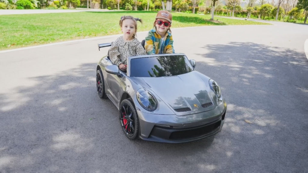 Ignite your child's imagination with the officially licensed Freddo Toys 24V Porsche 911 GT3 2-Seater Ride-On Car. Designed for young enthusiasts aged 6 and up, this stunning red ride-on replicates the iconic sports car with incredible detail. It offers a realistic driving experience with a pedal brake, button start, and an integrated music system with USB, radio, and Bluetooth connectivity for endless entertainment. The durable EVA tires ensure a smooth ride, while bright LED lights add to the authenticity and fun. With its comfortable leather seats and safety seatbelts, your child can enjoy hours of secure playtime, reaching speeds powered by 2 180-320W SILENT MOTOR. The remote control allows parents to supervise and assist, making it the perfect gift for aspiring drivers.