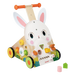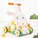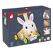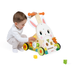 The Janod Wooden Rabbit Activity Walker is a multi-functional toy designed for children aged 12 months and up. This charming rabbit-themed walker offers 9 interactive activities across three sides, including a looping circuit with carrots, a traditional shape sorter, a sliding mouse in a labyrinth, a bee maze, gears, and a sound-producing sun. Its adjustable handle (46–53 cm) and brake system allow for tailored support as children learn to walk. Crafted from FSC-certified wood, it features tactile elements like felt ears and cheeks, and its rotating eyes add to the sensory experience. This walker promotes the development of fine motor skills, dexterity, and spatial awareness.