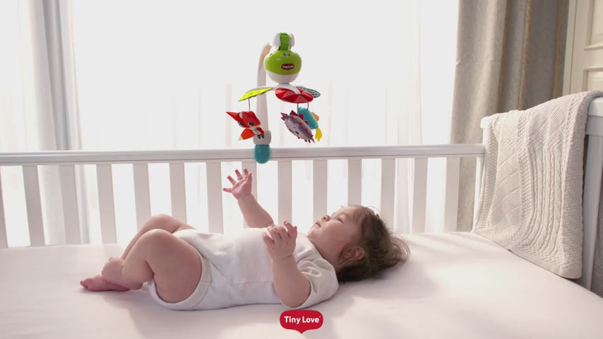 Perfect for families on the go, this mobile brings comforting sights and sounds wherever baby’s day takes them.